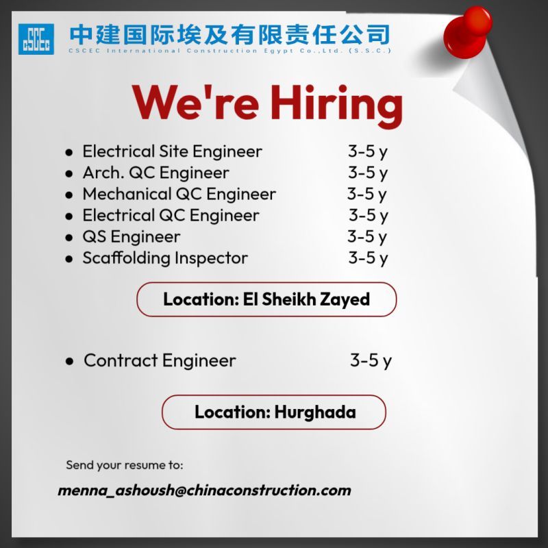 شركة CSCEC International Construction Egypt تعلن عن فرص عمل فورية لمجموعة من التخصصات الهندسية ضمن مشروعات كبرى في الشيخ زايد والغردقة.