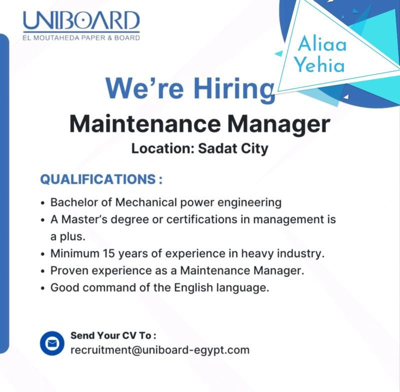 تعلن شركة UNIBOARD – المتحدة للورق والكرتون عن فرصة وظيفية قيادية مميزة لشغل منصب مدير صيانة للعمل في موقعها الصناعي بمدينة السادات.