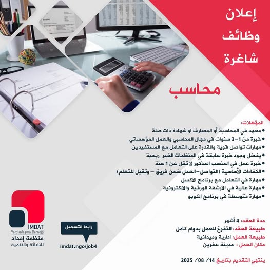 منظمة إمداد للإغاثة والتنمية تعلن عن توفر شاغر وظيفي بمسمى “محاسب” للعمل ضمن كوادرها في مدينة عفرين.