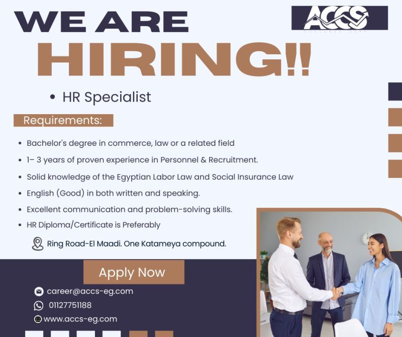 تعلن ACCS عن حاجتها إلى تعيين HR Specialist للانضمام إلى فريق الموارد البشرية والعمل في بيئة احترافية ومنظمة.