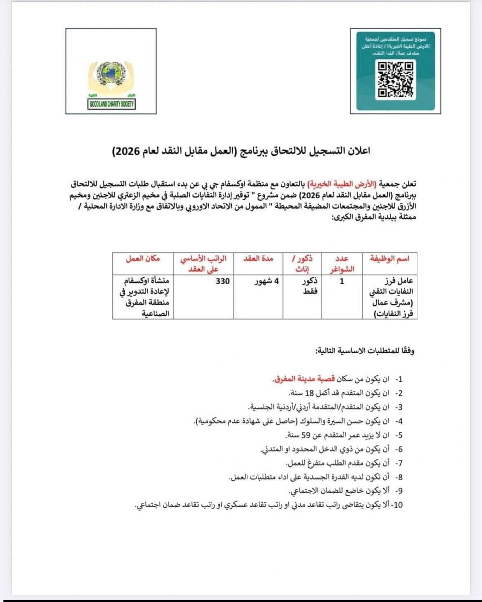 تُعلن جمعية الأرض الطيبة الخيرية وبالتعاون مع منظمة أوكسفام – GB عن بدء استقبال طلبات التسجيل للالتحاق ببرنامج العمل مقابل النقد لعام 2026، ضمن مشروع يهدف إلى تحسين إدارة النفايات الصلبة في: