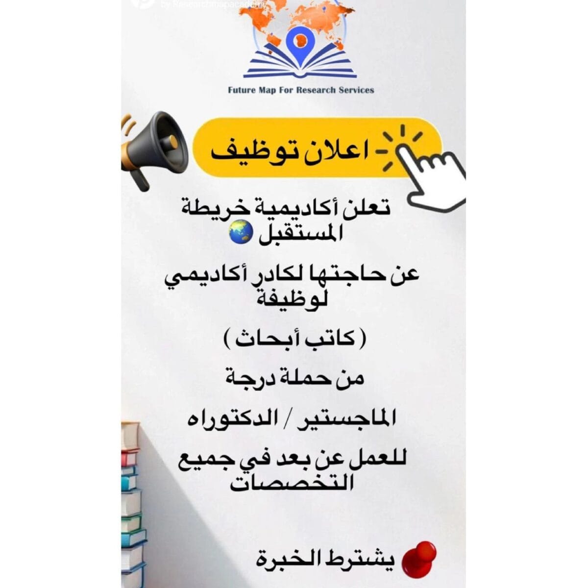 تُعلن أكاديمية خريطة المستقبل للأبحاث العلمية عن حاجتها إلى كُتّاب أبحاث أكاديميين محترفين للعمل عن بُعد ضمن فريقها البحثي المتخصص.