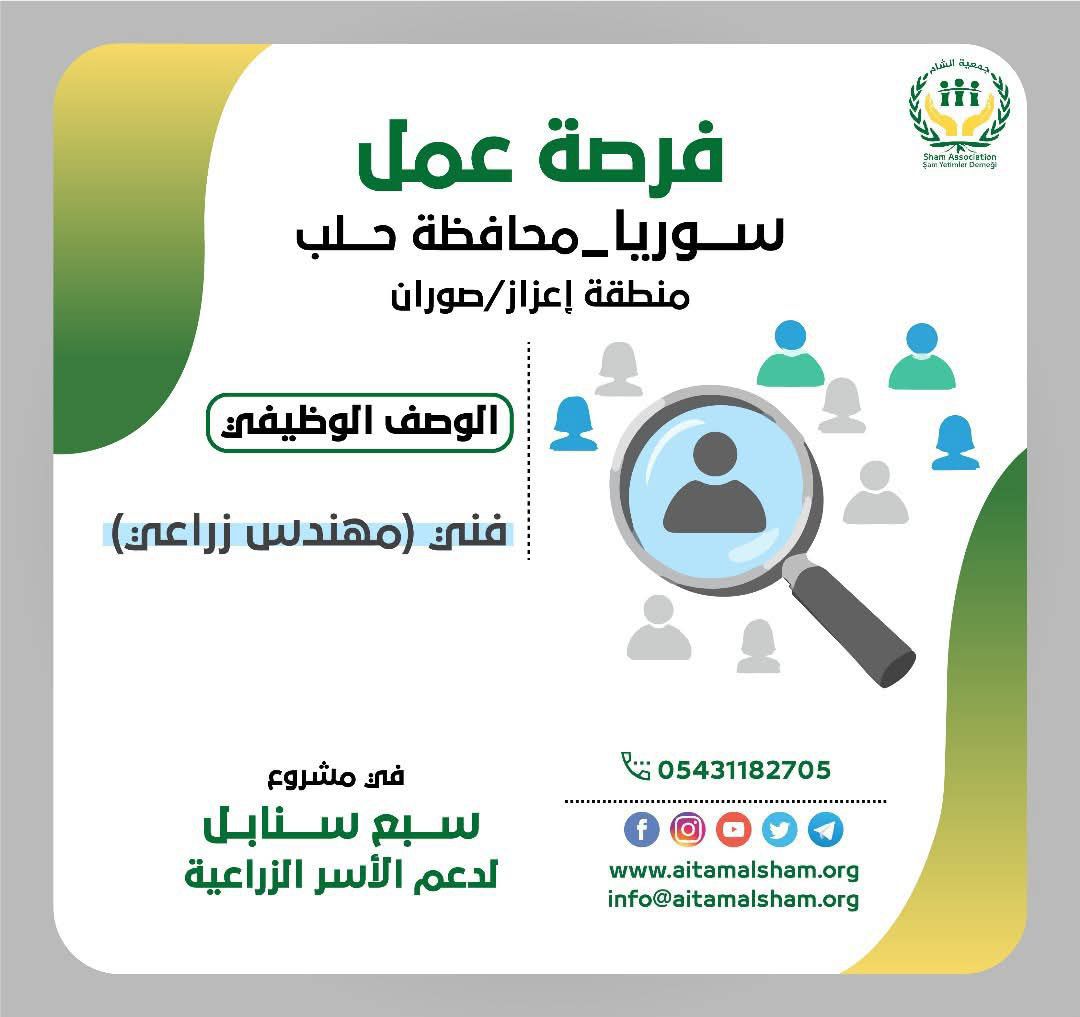 🌱 فرصة عمل مميزة في القطاع الزراعي ضمن مشروع “سبع سنابل لدعم الأسر الزراعية” في منطقة إعزاز/صوران – محافظة حلب.