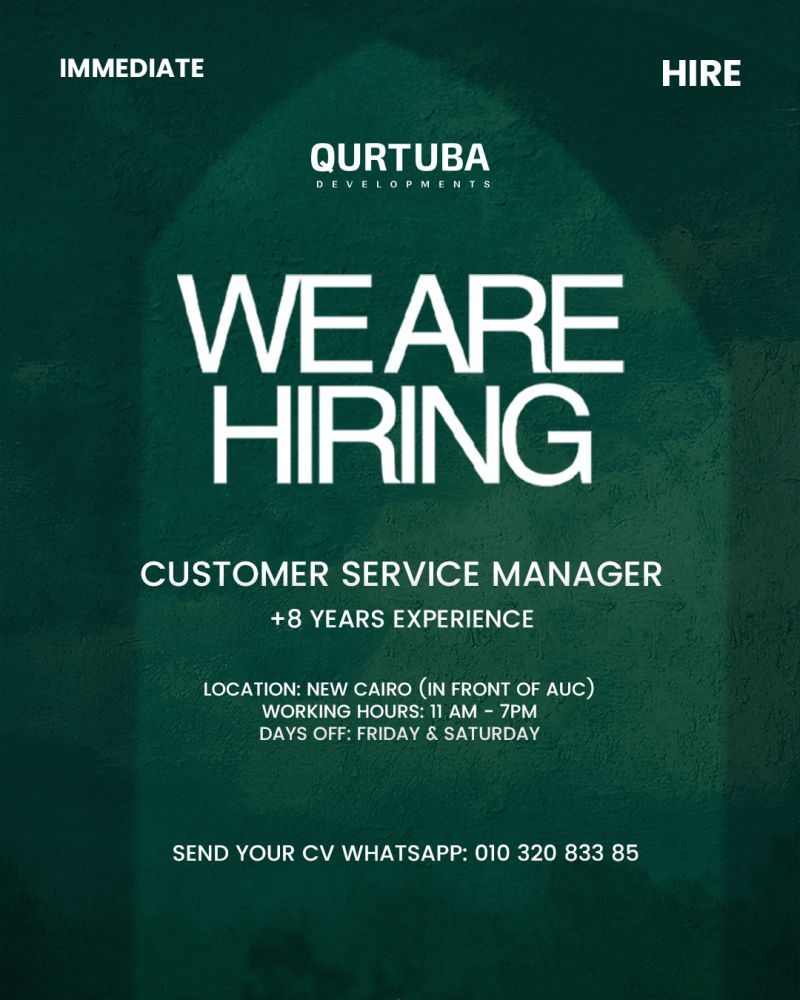 تعلن Qurtuba Developments عن توظيف فوري لشغل وظيفة Customer Service Manager للانضمام إلى فريقها الإداري، ضمن بيئة عمل احترافية في واحدة من شركات التطوير العقاري المتنامية.