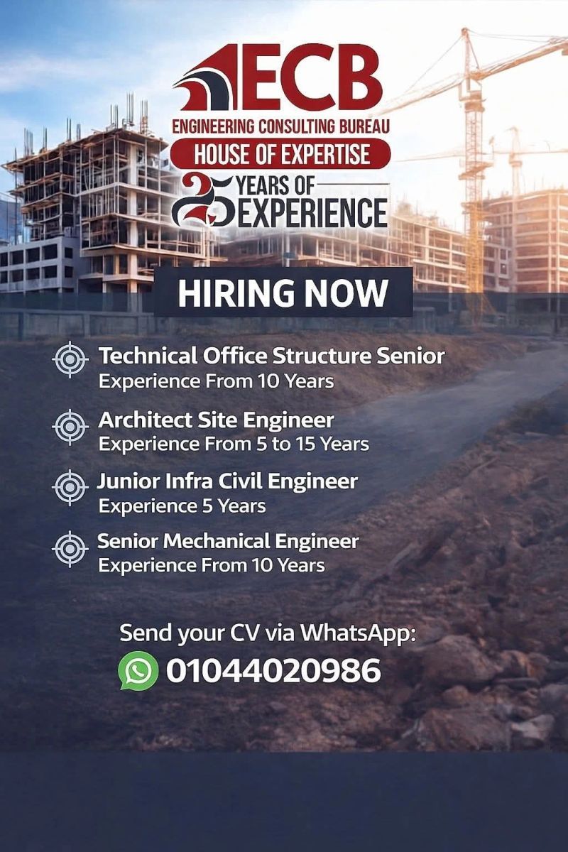 تعلن ECB – Engineering Consulting Bureau (خبرة أكثر من 25 عامًا) عن فتح باب التوظيف لعدد من الوظائف الهندسية المميزة للعمل ضمن مشاريع كبرى وبيئة احترافية قائمة على الخبرة والتميز.