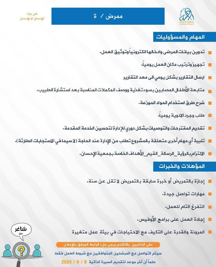 ✅ وظائف طبية – جمعية الإحسان في سوريا 2025