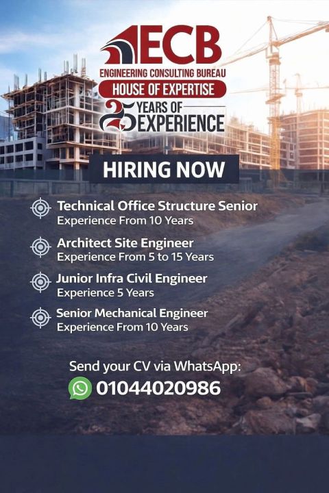 تعلن شركة ECB – Engineering Consulting Bureau، إحدى كبرى شركات الاستشارات الهندسية، عن فتح باب التوظيف الفوري لعدد من التخصصات الهندسية للعمل في مشاريع كبرى داخل بيئة احترافية مستقرة.