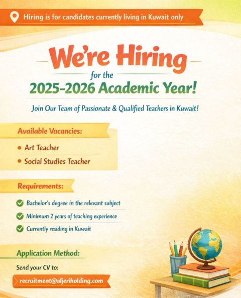 تُعلن إحدى الجهات التعليمية بالكويت عن فتح باب التوظيف للعام الدراسي 2025–2026، وتدعو المعلمين المؤهلين والمقيمين داخل دولة الكويت فقط للانضمام إلى فريق تعليمي متميز في بيئة عمل احترافية وداعمة.