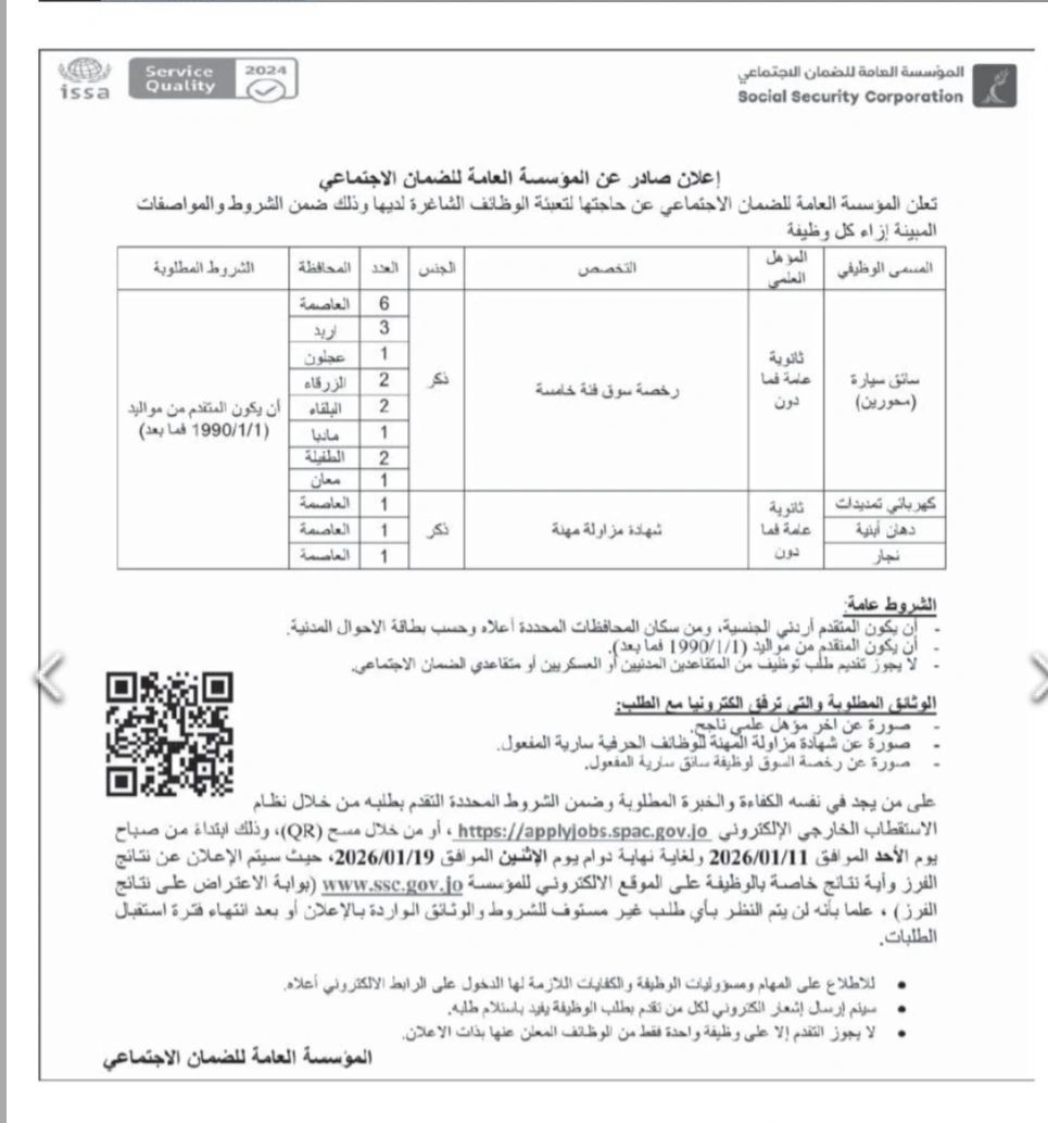 المؤسسة العامة للضمان الاجتماعي تعلن عن وظائف شاغرة في عدة تخصصات، إليك التفاصيل: