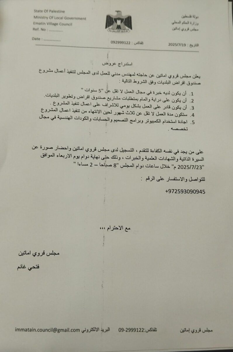 يعلن مجلس قروي إماتين عن حاجته لتوظيف مهندس مدني للعمل ضمن مشروع ممول من صندوق إقراض وتطوير البلديات، وذلك وفق الشروط التالية: