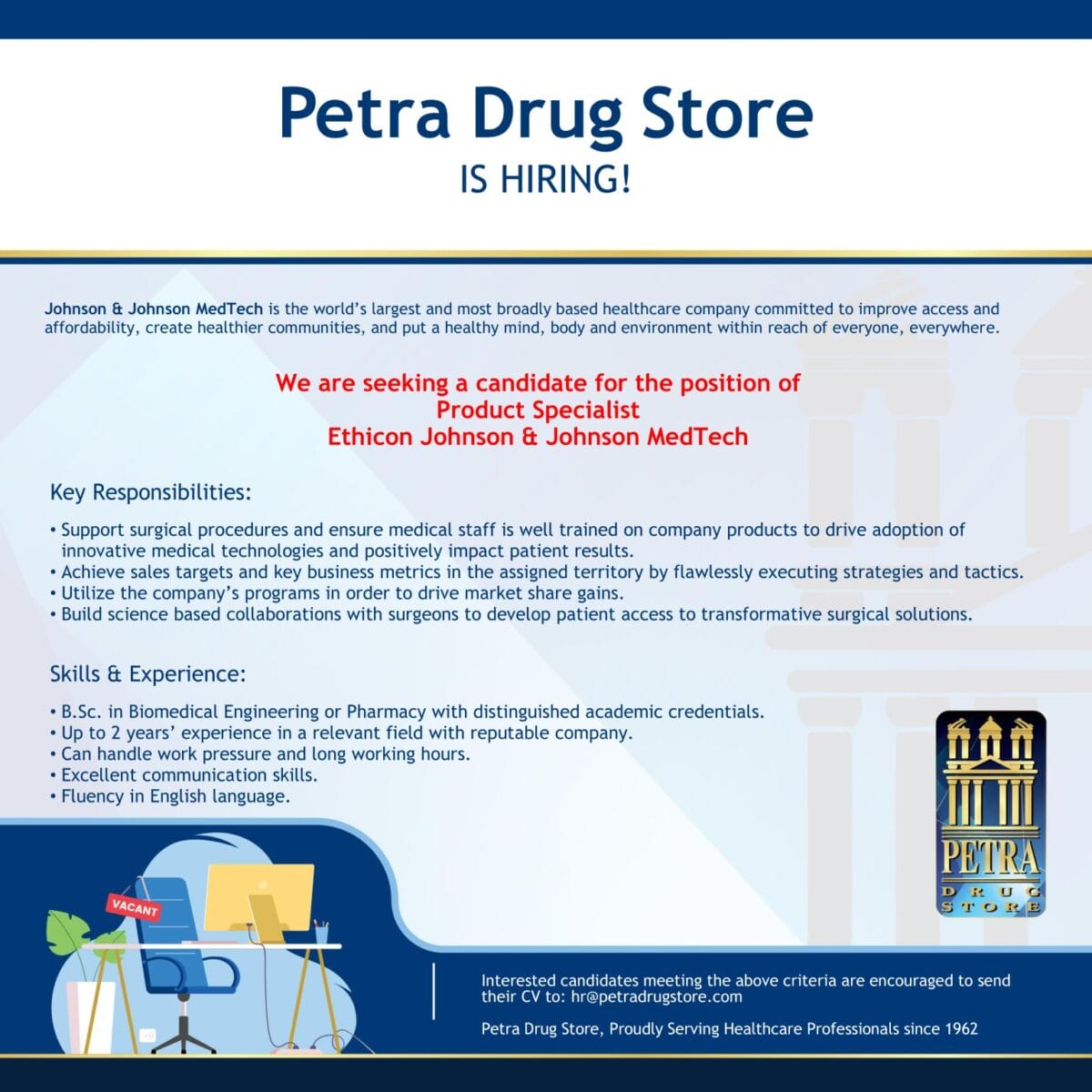تعلن Petra Drug Store عن فتح باب التقديم لوظيفة Product Specialist للعمل مع