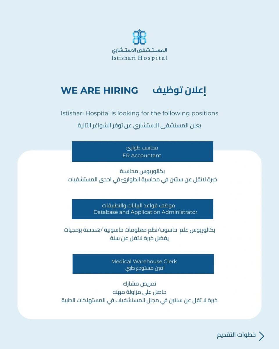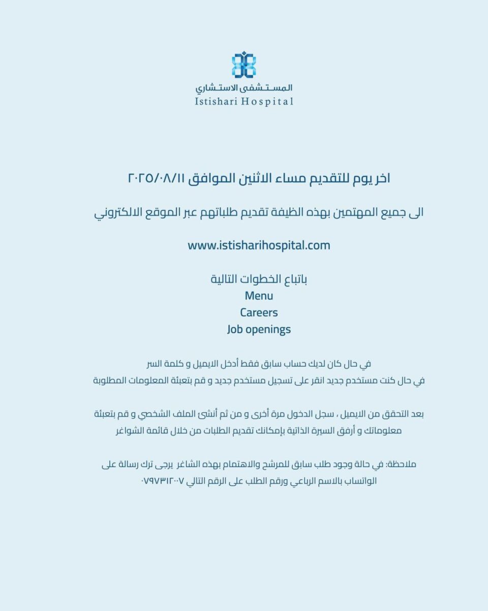 يُعلن المستشفى الاستشاري في العاصمة عمّان عن حاجته لتعيين عدد من الموظفين في المجالات الطبية والإدارية، على النحو التالي: