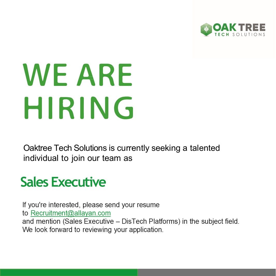 تعلن Oaktree Tech Solutions عن فتح باب التوظيف لشغل وظيفة Sales Executive للانضمام إلى فريقها المتخصص في المنصات الرقمية، حلول DisTech، والأنظمة السحابية (SaaS)، ضمن بيئة تقنية احترافية وفرص نمو حقيقية.