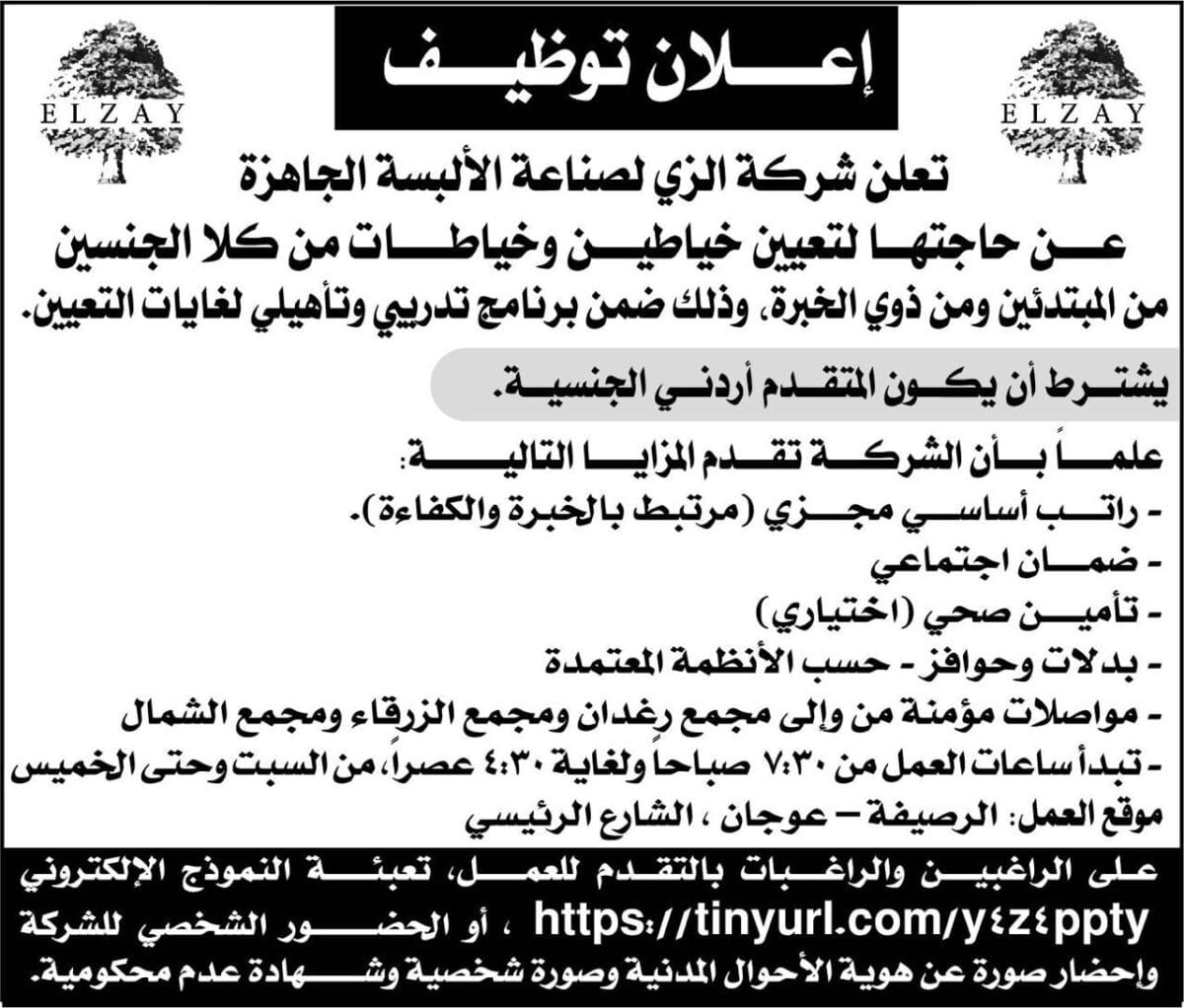 تعلن شركة الزي عن حاجتها لتعيين خياطين وخياطات من كلا الجنسين، سواء مبتدئين أو ذوي خبرة، ضمن برنامج تدريبي وتأهيلي يضمن التعيين بعد اجتياز التدريب.