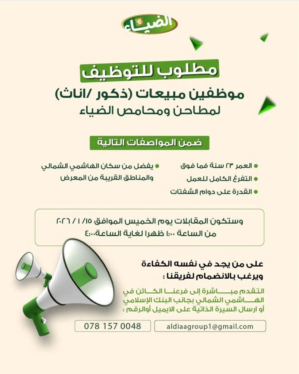 تعلن مطاحن ومحامص الضياء عن فتح باب التوظيف لـ موظفين وموظفات مبيعات للعمل ضمن فرعها في الهاشمي الشمالي، مع فرصة مباشرة للمقابلة والتعيين.