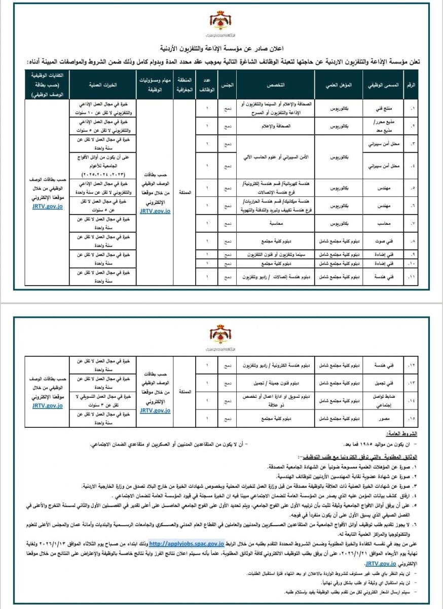 أعلنت مؤسسة الإذاعة والتلفزيون الأردنية (JRTV) عن حاجتها لتعيين عدد من الكفاءات المؤهلة للعمل بعقود محددة المدة وبدوام كامل، ضمن مجموعة واسعة من التخصصات الإعلامية، الهندسية، التقنية، الإدارية والفنية.