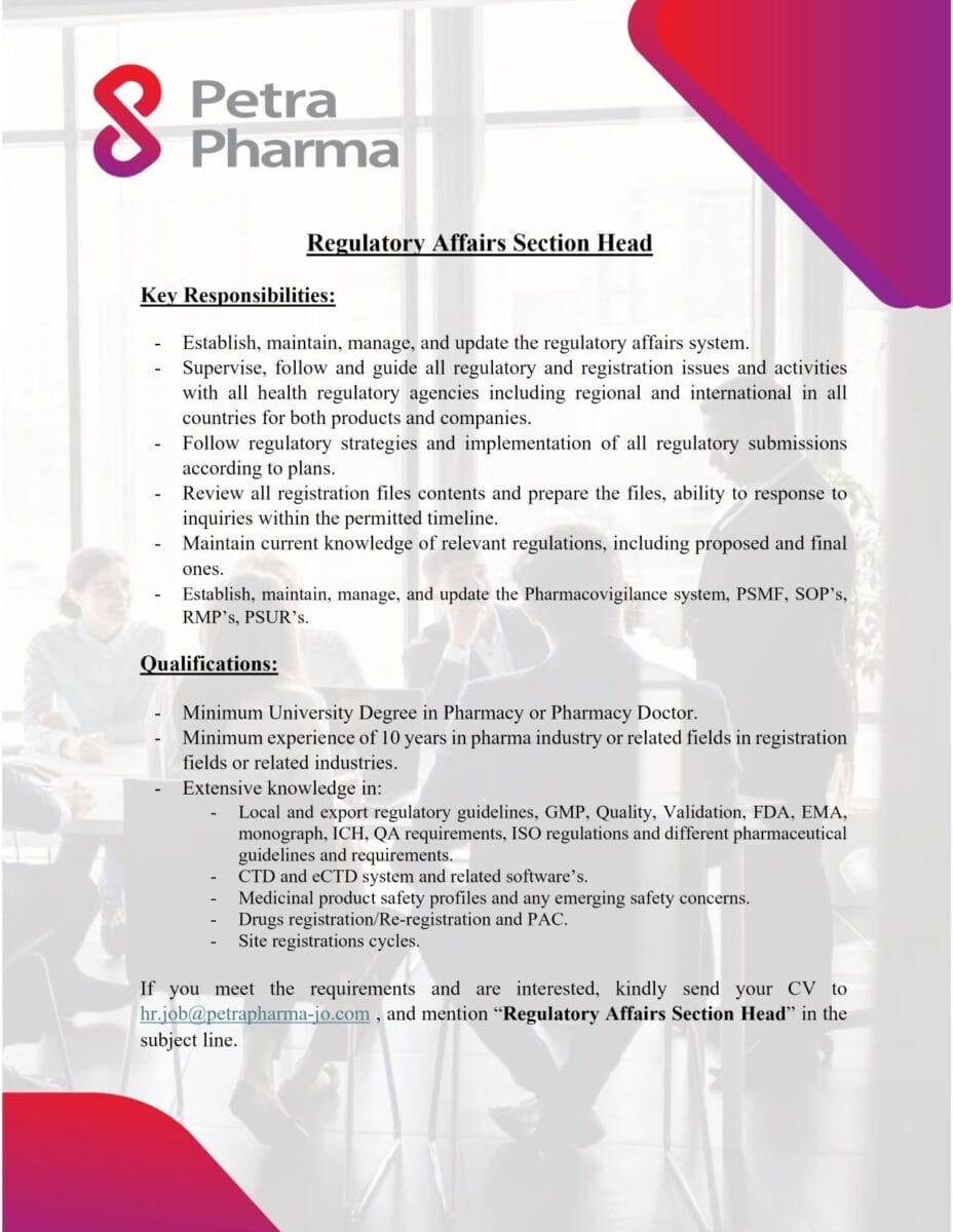 تعلن شركة Petra Pharma عن توفر شاغر وظيفي مميز لمنصب Regulatory Affairs Section Head، وذلك ضمن بيئة احترافية رائدة في قطاع الصناعات الدوائية، مع فرص حقيقية للتأثير وصنع القرار.