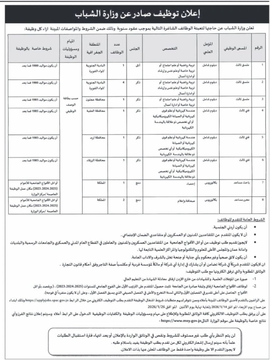 تعلن وزارة الشباب الأردنية عن فتح باب التقديم لتعبئة عدد من الوظائف الشاغرة بعقود سنوية في مختلف محافظات المملكة، وذلك وفق تخصصات محددة وشروط واضحة، ضمن فرص عمل رسمية مضمونة.