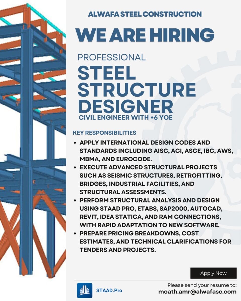 هذه الوظيفة مناسبة لكل من يبحث عن وظائف مهندسين مدنيين، Steel Structure Designer Jobs، تصميم منشآت معدنية، وظائف تصميم إنشائي، Structural Engineer Steel في بيئة احترافية تعتمد على المعايير العالمية وبرامج التحليل المتقدمة.