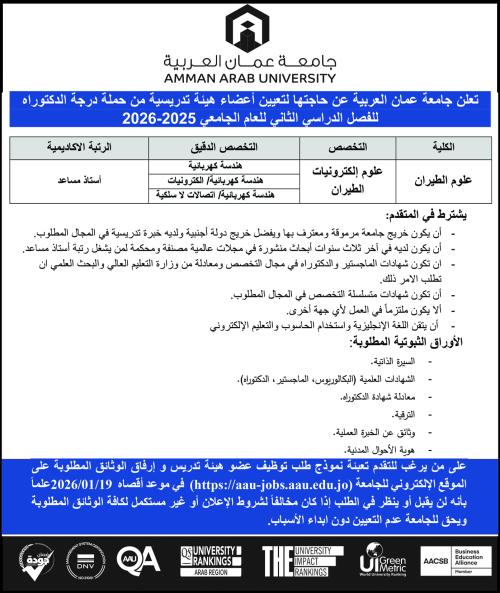 في إطار سعيها لاستقطاب الكفاءات الأكاديمية المتميزة، تعلن جامعة عمان العربية عن حاجتها لتعيين أعضاء هيئة تدريس من حملة درجة الدكتوراه للفصل الدراسي الثاني من العام الجامعي 2025–2026، ضمن مجموعة من التخصصات الأكاديمية المعتمدة.