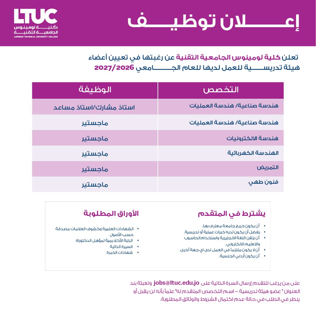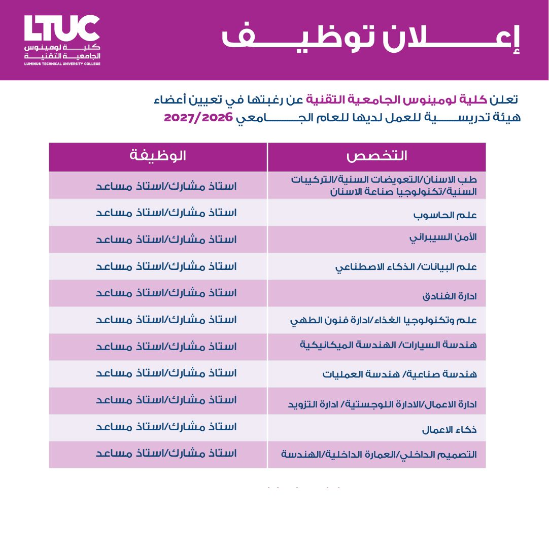 تُعلن كلية لومينوس الجامعية التقنية (LTUC) عن فتح باب التعيين لأعضاء هيئة تدريسية للعمل لديها للعام الجامعي 2026/2027، ضمن مجموعة واسعة من التخصصات التقنية والأكاديمية المطلوبة.