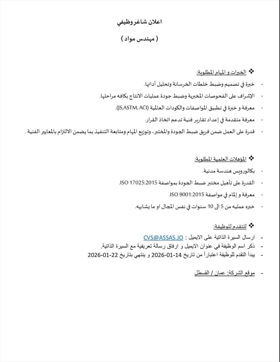 تُعلن شركة رائدة في مجال ضبط الجودة والاختبارات الهندسية عن حاجتها لتعيين مهندس مواد متخصص في الخرسانة يمتلك خبرة عميقة وقدرة قيادية للانضمام إلى فريق احترافي عالي المستوى في عمّان – القسطل.