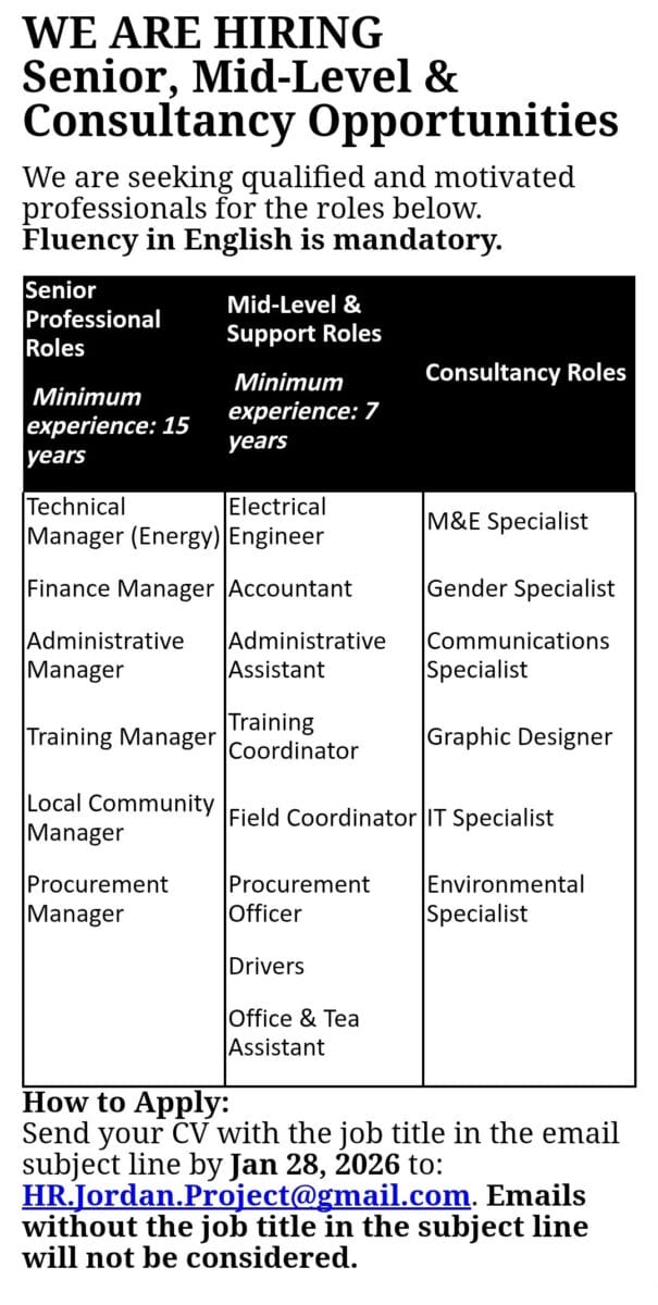 إذا كنت تبحث عن وظائف هندسية، إدارية، مالية، تقنية أو استشارية في 2026، فهذا الإعلان يوفّر فرص توظيف حقيقية لذوي الخبرة المتوسطة والعليا في مجالات متعددة، مع آلية تقديم واضحة وسريعة.