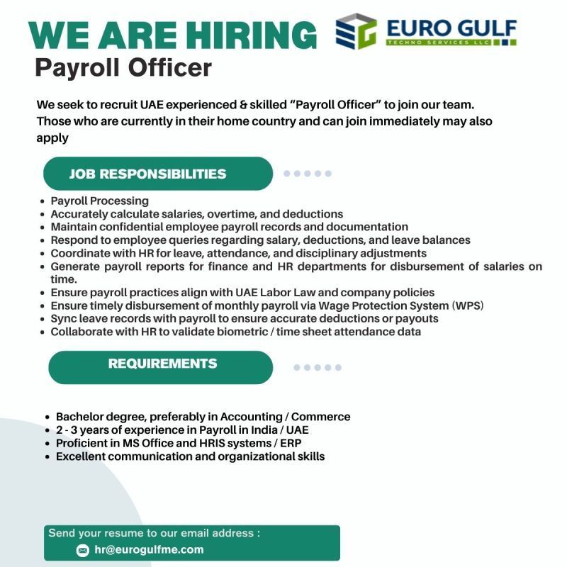 تعلن Euro Gulf Techno Services LLC عن حاجتها لتعيين Payroll Officer محترف للانضمام إلى فريقها في الإمارات، ضمن بيئة عمل احترافية تلتزم بأعلى معايير الموارد البشرية وأنظمة الرواتب.
