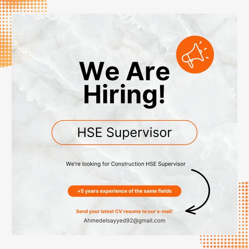 نعلن عن حاجتنا إلى HSE Supervisor للانضمام إلى فريق عمل احترافي والمشاركة في مشروعات إنشائية نشطة.