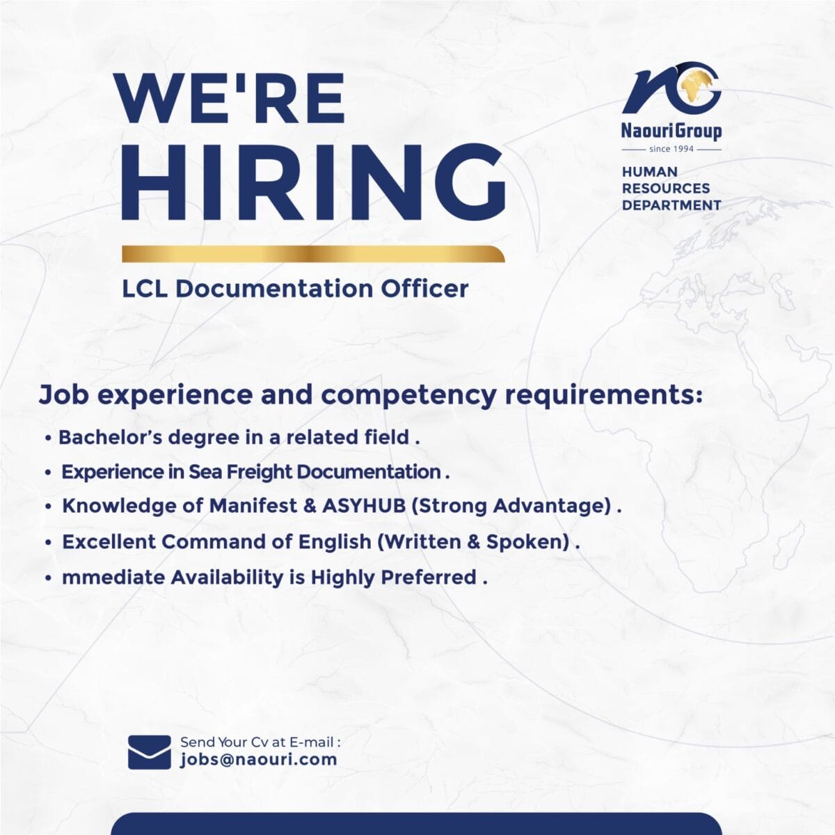إذا كنت تمتلك خبرة حقيقية في توثيق شحنات LCL وتبحث عن فرصة مستقرة داخل مجموعة رائدة، فهذه الوظيفة صُممت لك.