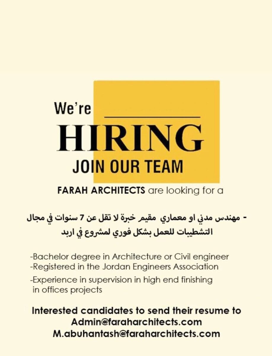 تعلن Farah Architects عن حاجتها إلى مهندس معماري أو مهندس مدني بخبرة قوية في الإشراف على التشطيبات عالية المستوى، للعمل بشكل فوري في مشروع مميز داخل الأردن.