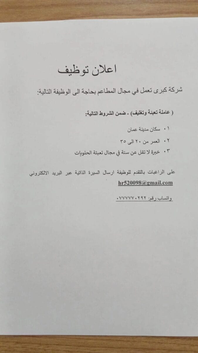 شركة كبرى تعمل في قطاع المطاعم والصناعات الغذائية تعلن عن حاجتها لتعيين عاملة تعبئة وتغليف ضمن فريقها في مدينة عمّان.