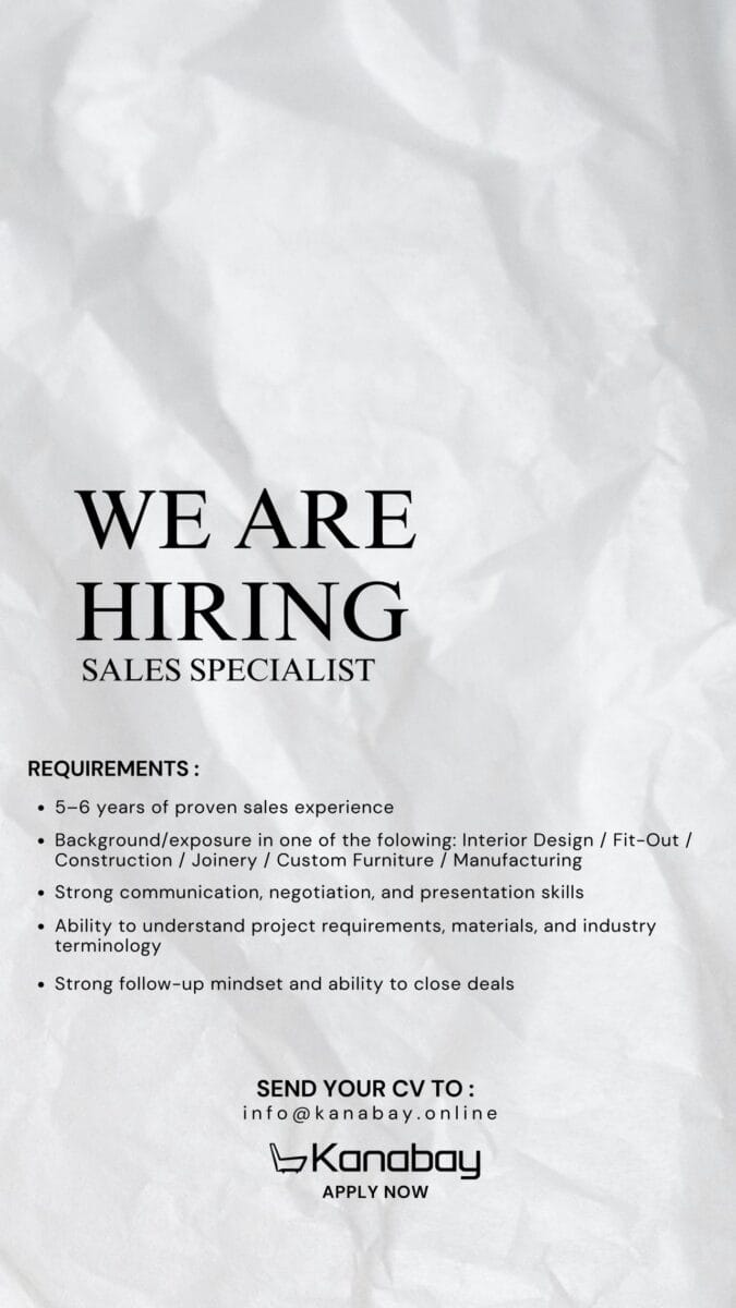 تعلن شركة رائدة عن حاجتها لتعيين Sales Executive / تطوير أعمال ذو خبرة قوية في قطاع التصميم الداخلي والمعماري، ويفضل من لديه خلفية مصنع / تصنيع (أثاث مخصص، نجارة، فيت أوت، أعمال خشبية، إلخ).