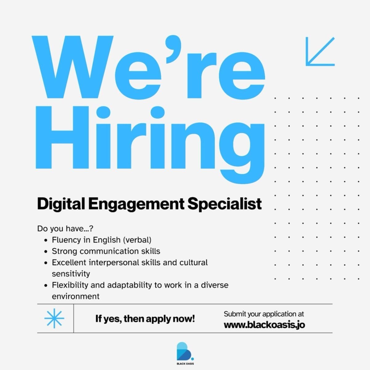 شركة Black Oasis في عمان تبحث عن موظف يتقن اللغة الإنجليزية للانضمام إلى فريقها، لتسهيل التواصل مع العملاء والشركاء والعمل ضمن بيئة عمل متنوعة.