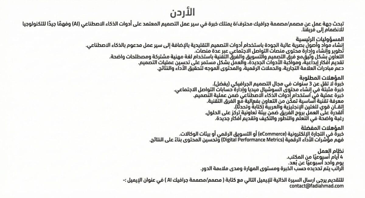🎨 وظيفة شاغرة – مصمم / مصممة جرافيك (AI) | الأردن
