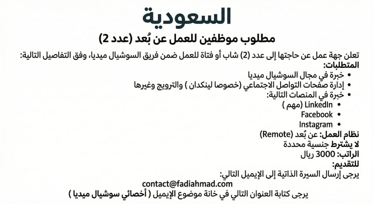 هذه الوظيفة مناسبة لكل من يبحث عن وظائف سوشيال ميديا عن بُعد في السعودية، أو عمل أونلاين في إدارة حسابات التواصل الاجتماعي براتب ثابت وفرصة تطوير مهني حقيقية.