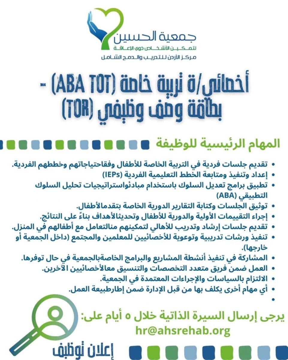 مطلوب أخصائي/أخصائية تربية خاصة (ABA / TOT) – فرصة مهنية مؤثرة في التأهيل