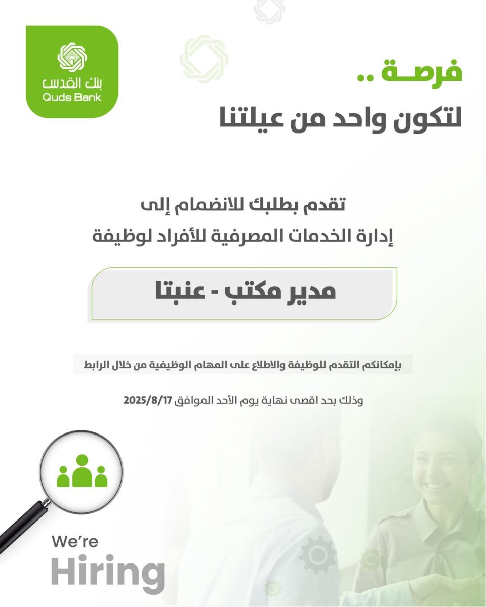 يعلن بنك القدس عن توفر شاغر مدير مكتب في فرع عنبتا – طولكرم، وذلك ضمن خطته لاستقطاب الكفاءات المصرفية ذات الخبرة والقدرة على القيادة لتحقيق الأهداف البيعية وتقديم خدمة مصرفية عالية المستوى.