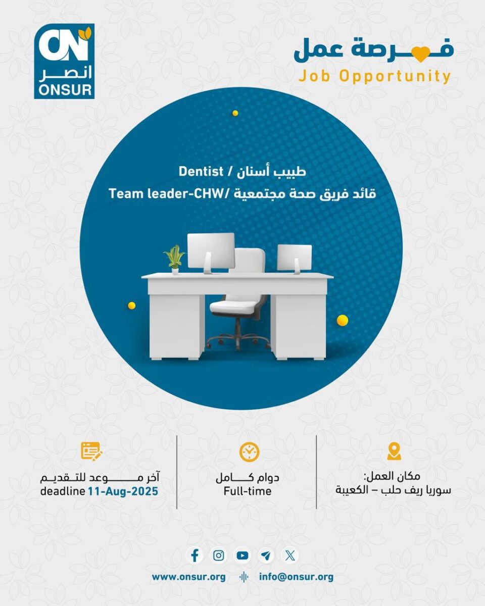 تعلن الهيئة العالمية للإغاثة والتنمية (أنصر) عن توفر فرص عمل مميزة في ريف حلب – الكعيبة، ضمن تخصصات طبية وإشرافية، حسب التفاصيل التالية: