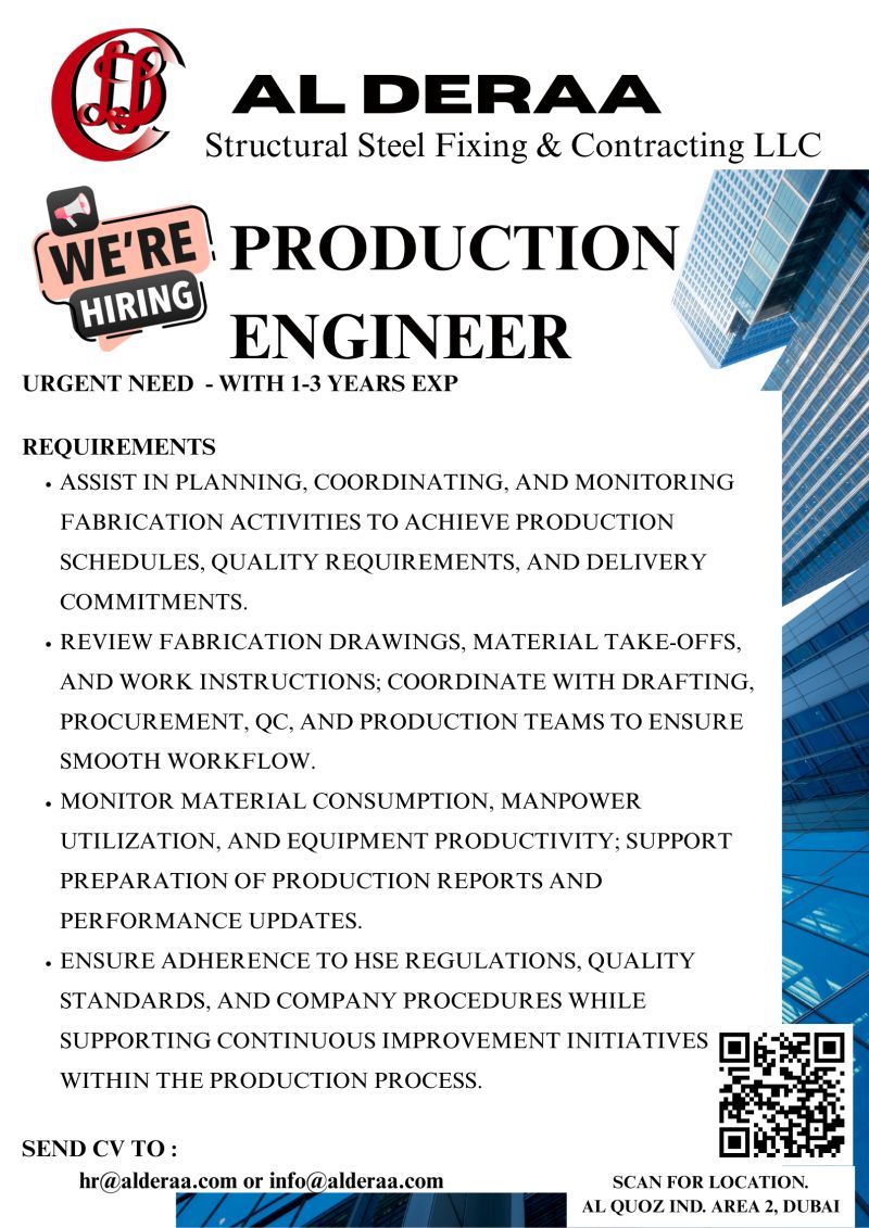 شركة AL DERAA Structural Steel Fixing & Contracting LLC تعلن عن حاجة فورية لتعيين Production Engineer بخبرة من 1 إلى 3 سنوات للانضمام إلى فريق الإنتاج والتصنيع.