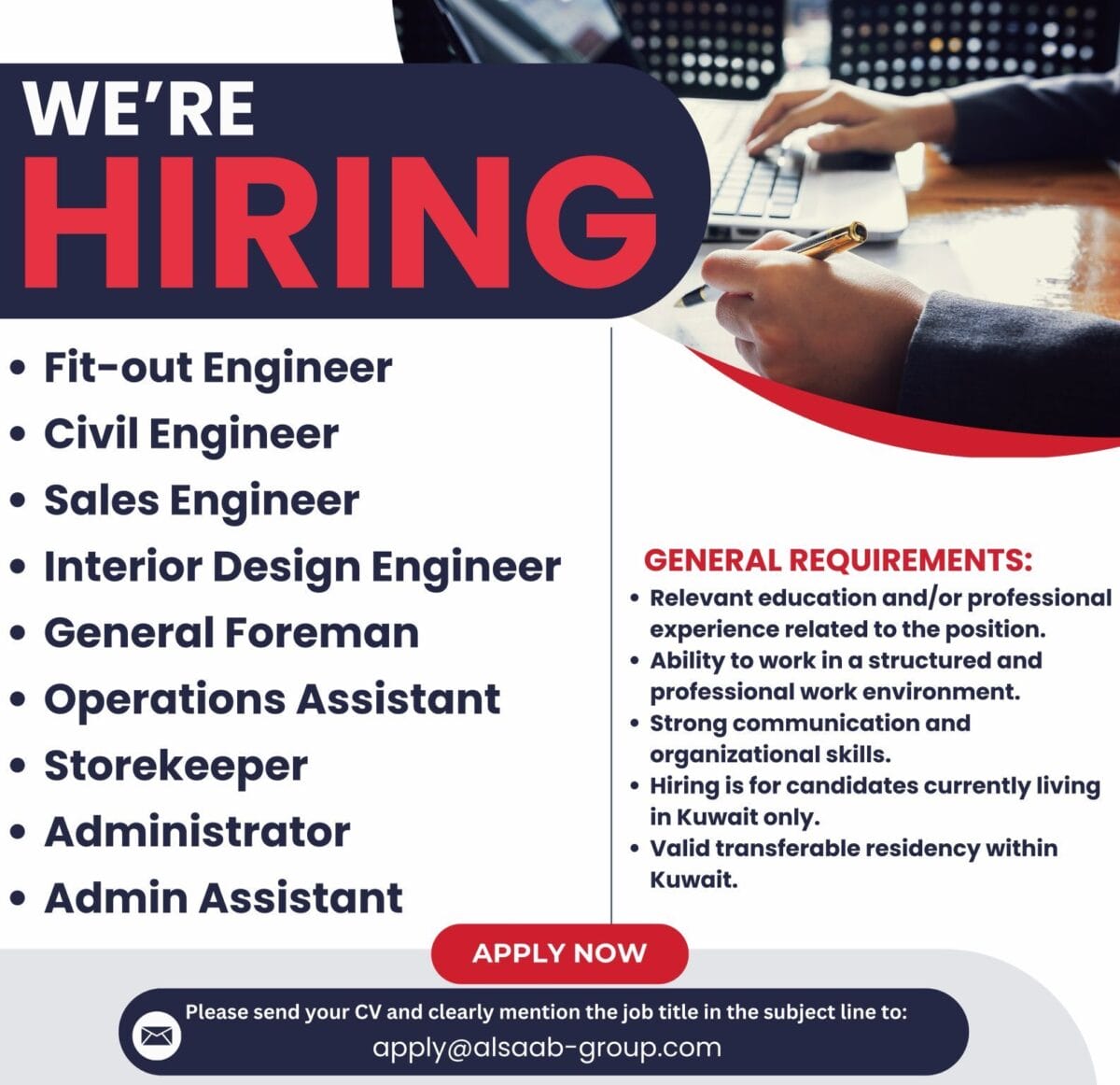 تعلن Alsaab Group عن توفر فرص عمل متعددة في الكويت لمهندسين وإداريين ذوي كفاءة، للعمل ضمن بيئة احترافية منظمة ومشاريع نشطة.