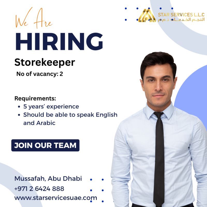 تعلن Star Services L.L.C عن توفر شواغر وظيفية بمسمى Storekeeper للانضمام إلى فريقها في مصفح – أبوظبي، ضمن بيئة عمل احترافية ومستقرة.