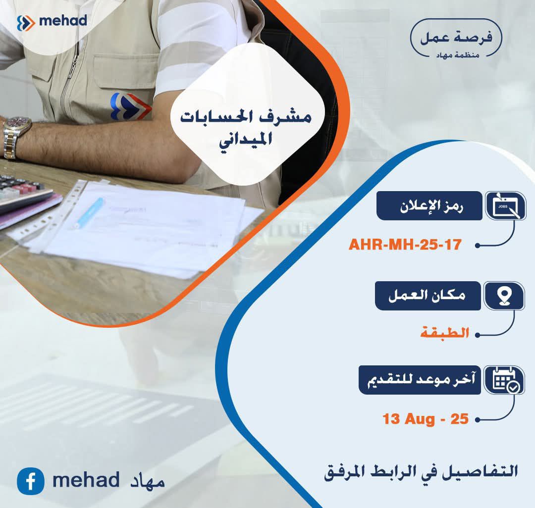 تُعلن منظمة مهاد الإنسانية عن رغبتها في تعيين مشرف حسابات ميداني، ضمن فريقها المالي، وذلك للعمل بمكتبها في مدينة الطبقة – سوريا.