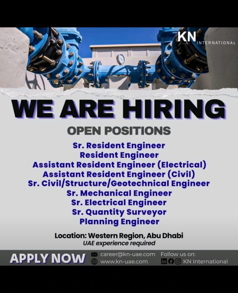 تعلن KN International عن فتح باب التوظيف لعدد من الوظائف الهندسية العليا والمتوسطة للعمل في المنطقة الغربية – أبوظبي.