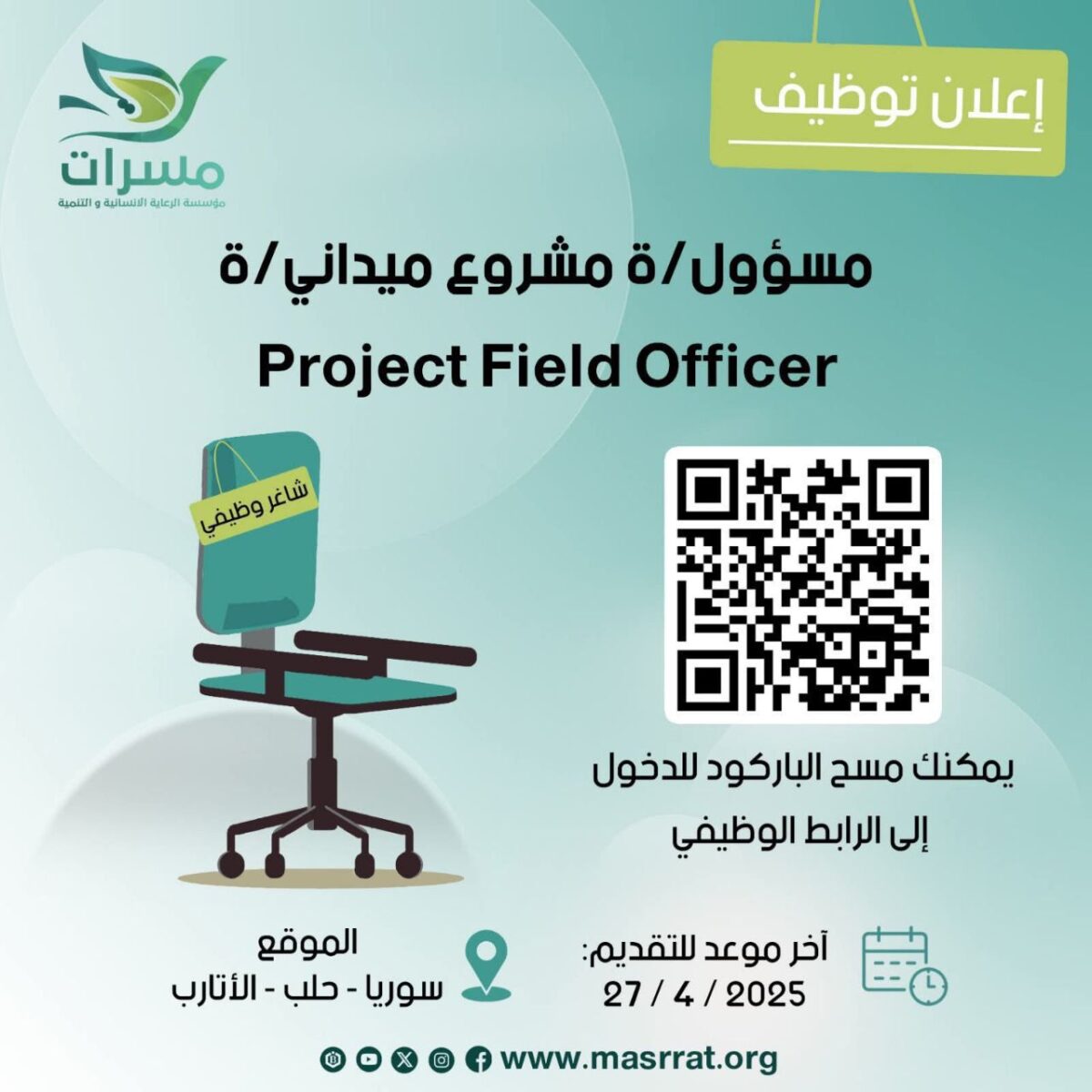 تعلن مؤسسة مسرات عن فتح باب التوظيف لضم مسؤول/ة مشروع ميداني/ة إلى فريقها العامل في سوريا، ضمن مدينة الأتارب – حلب.