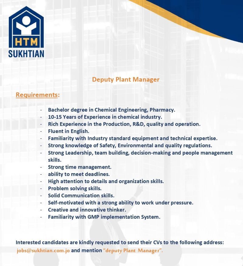 تعلن HTM Sukhtian عن حاجتها إلى نائب مدير مصنع (Deputy Plant Manager) للانضمام إلى فريقها القيادي، ضمن بيئة صناعية احترافية تعتمد أعلى معايير الجودة والسلامة والتطوير المستمر.