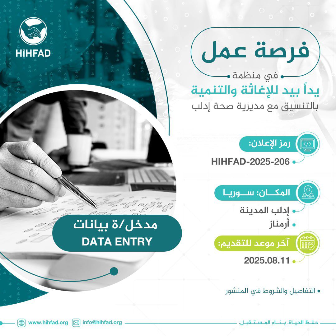 تُعلن منظمة يداً بيد للإغاثة والتنمية، وبالتعاون مع مديرية صحة إدلب، عن حاجتها لتعيين مدخل/ة بيانات للعمل ضمن مناطق: