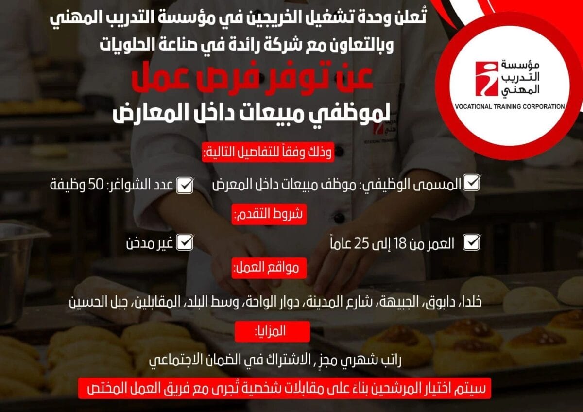 ضمن جهود مؤسسة التدريب المهني في دعم تشغيل الشباب وتمكين الخريجين، تعلن وحدة تشغيل الخريجين وبالتعاون مع شركة رائدة في صناعة الحلويات عن توفر فرص عمل فورية بعدد كبير من الشواغر.
