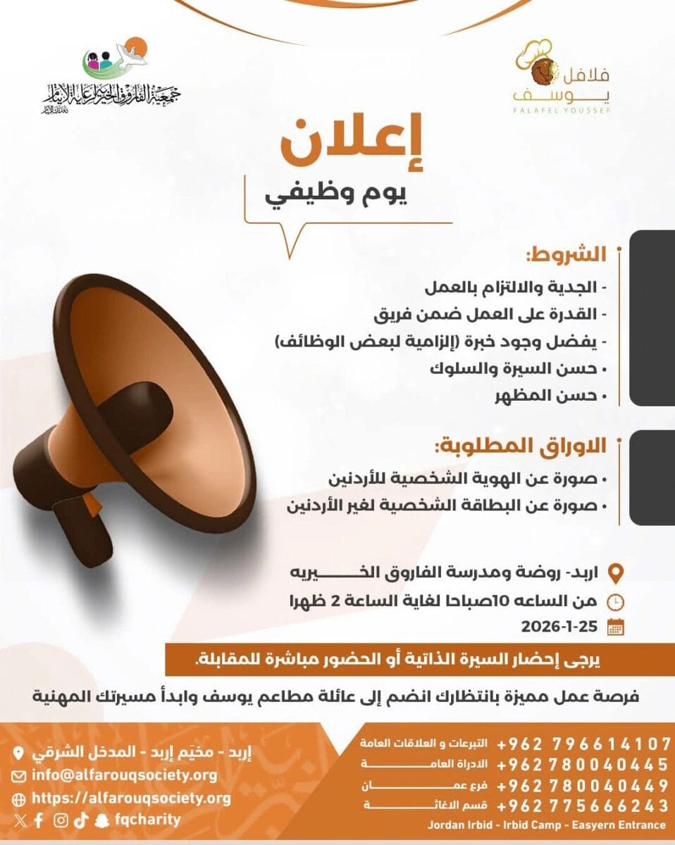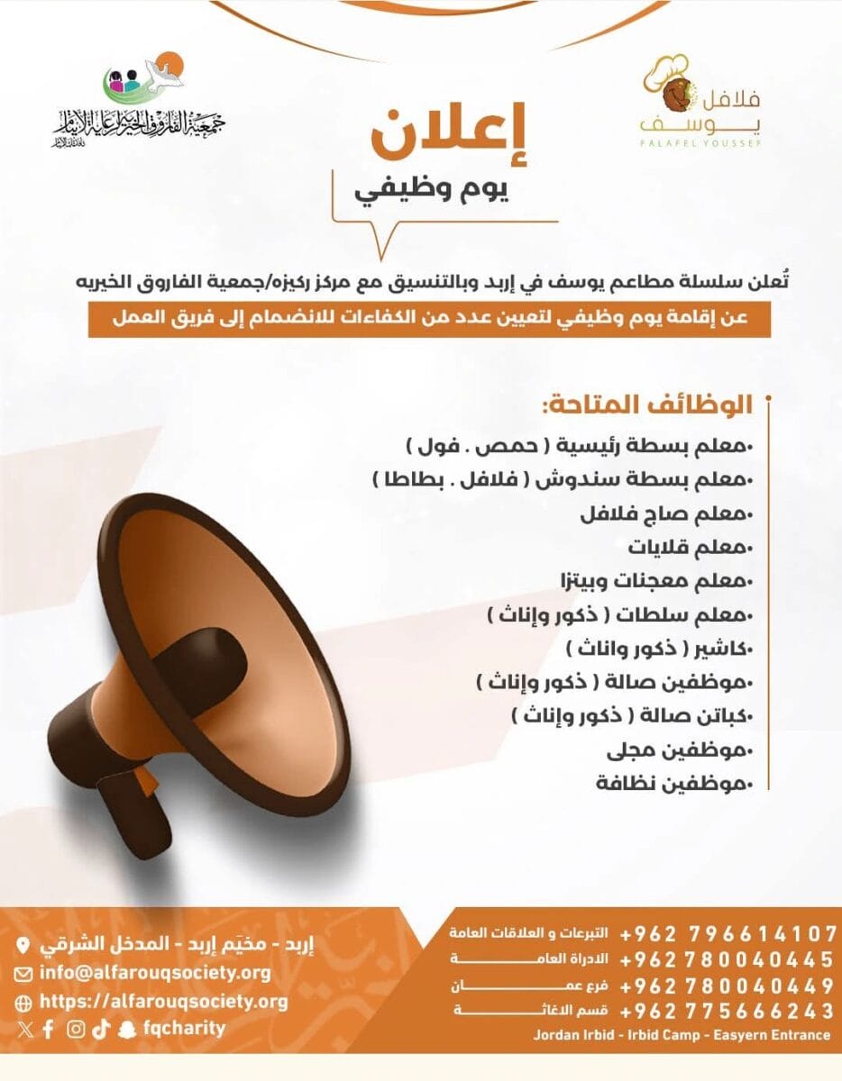 تعلن سلسلة مطاعم يوسف – إربد وبالتعاون مع جمعية الفاروق الخيرية عن إقامة يوم توظيف فوري لاستقطاب كفاءات جديدة للانضمام إلى فريق عمل متكامل ومتنامٍ.