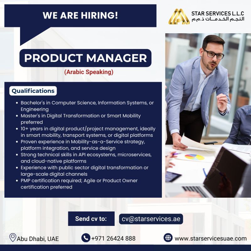 تعلن Star Services L.L.C عن فرصة وظيفية مميزة لتعيين Product Manager (Arabic Speaking) للعمل ضمن مشاريع التحول الرقمي والمنصات الذكية في أبوظبي – الإمارات.